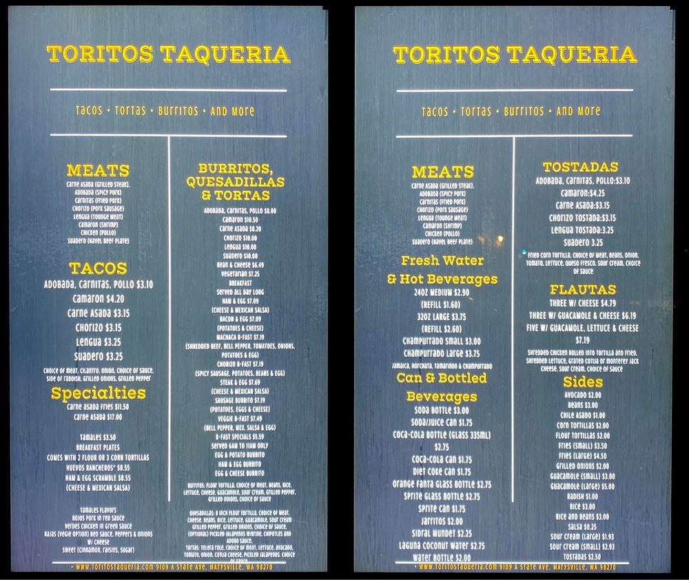 Toritos Taqueria Menu